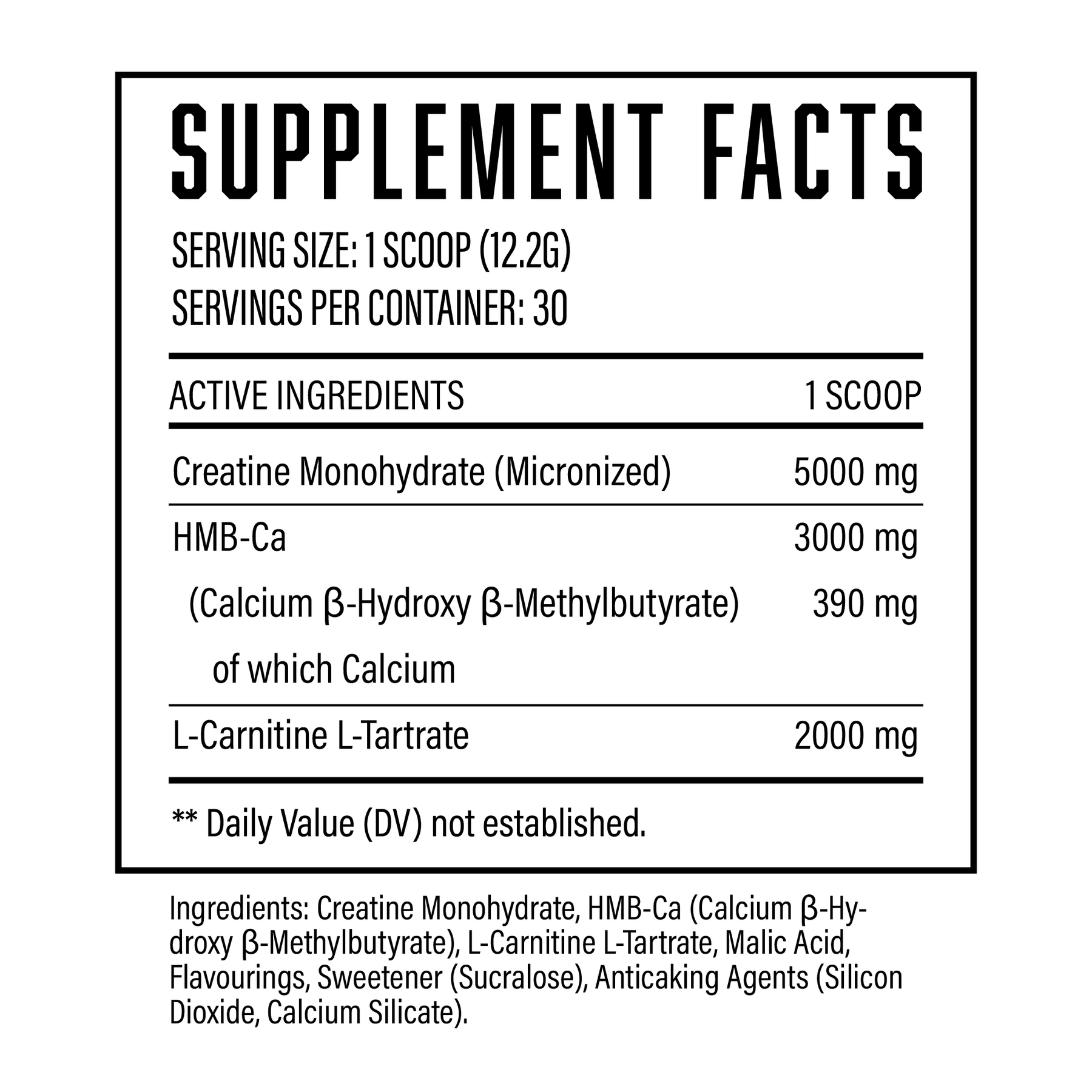 • 5000mg Creatine + 3000mg HMB + 2,000mg LCLT