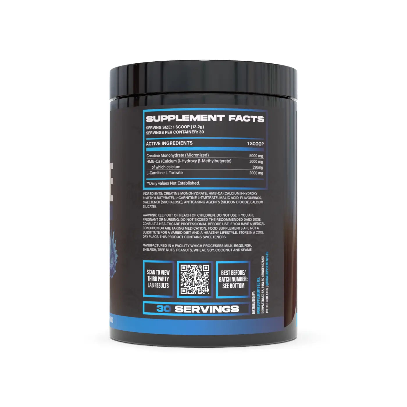The formula is fully transparent, with no proprietary blends, and delivers clinically dosed amounts of 5,000 mg of micronized creatine monohydrate, 3,000 mg of HMB-Ca, and 2,000 mg of L-carnitine L-tartrate per serving.