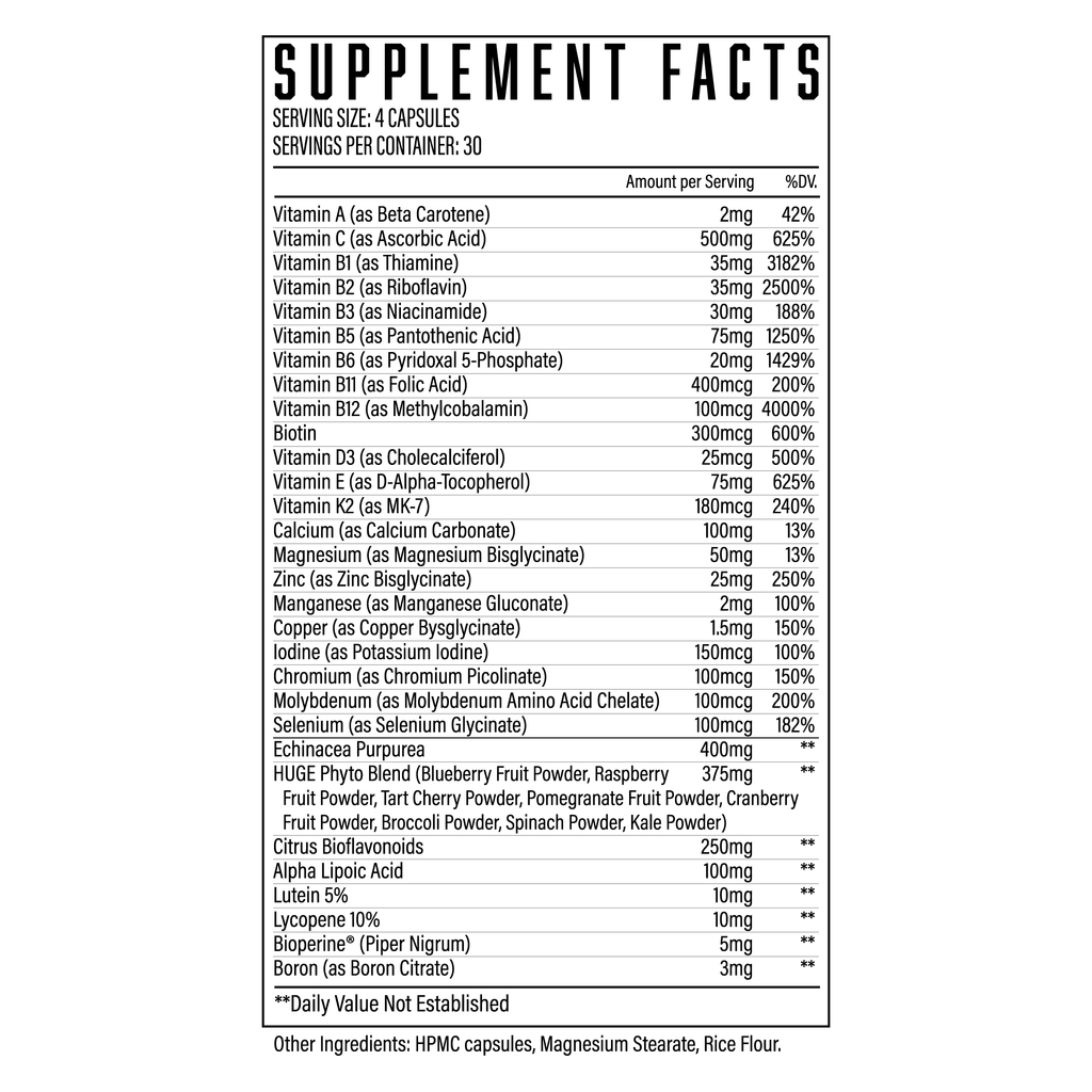 Huge Multi is the ultimate multivitamin packed with essential vitamins, minerals, and antioxidants. Our all-in-one formula is backed by the latest scientific findings and customized to match current nutritional data and the ideal intake levels for each nutrient.